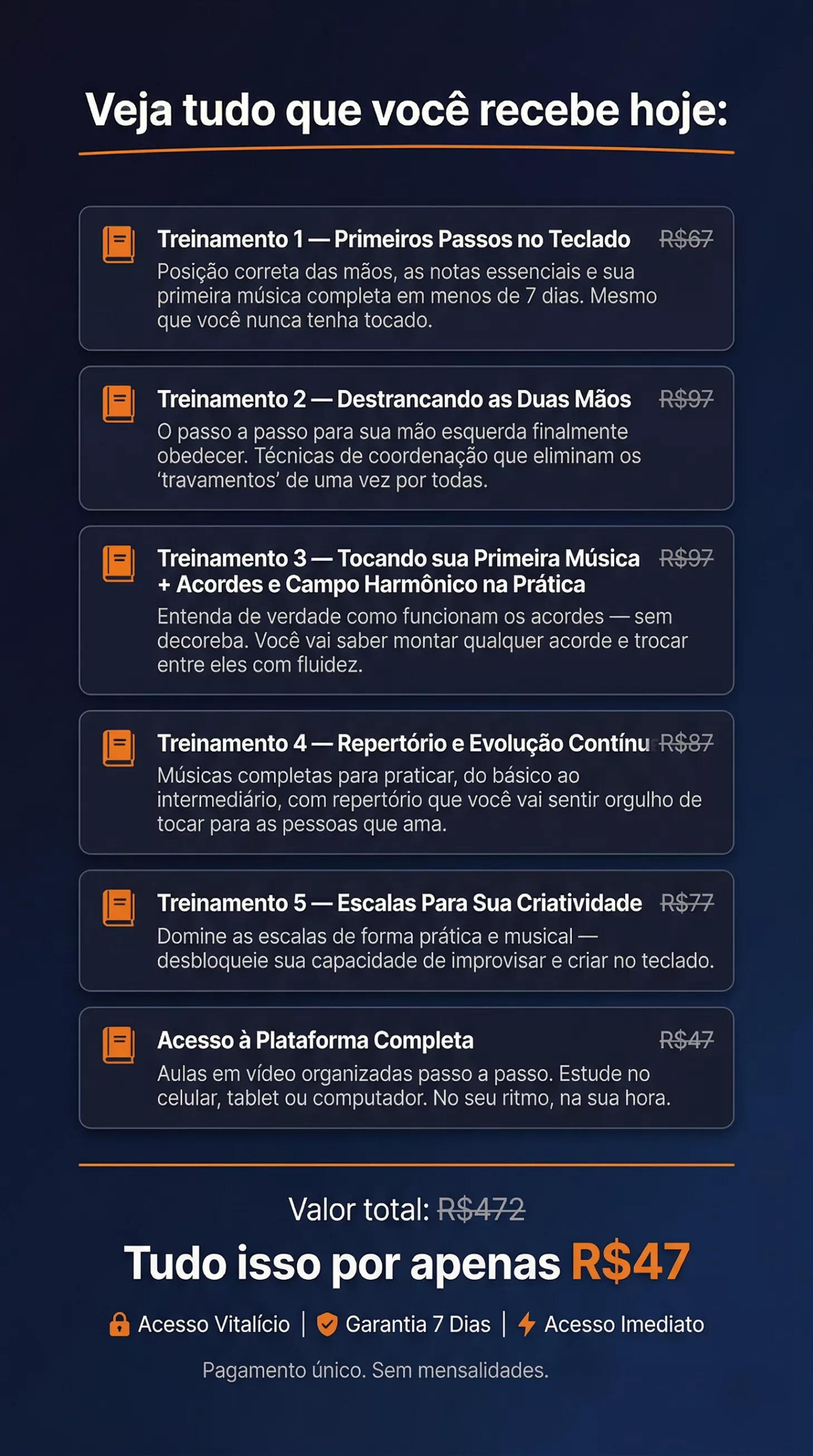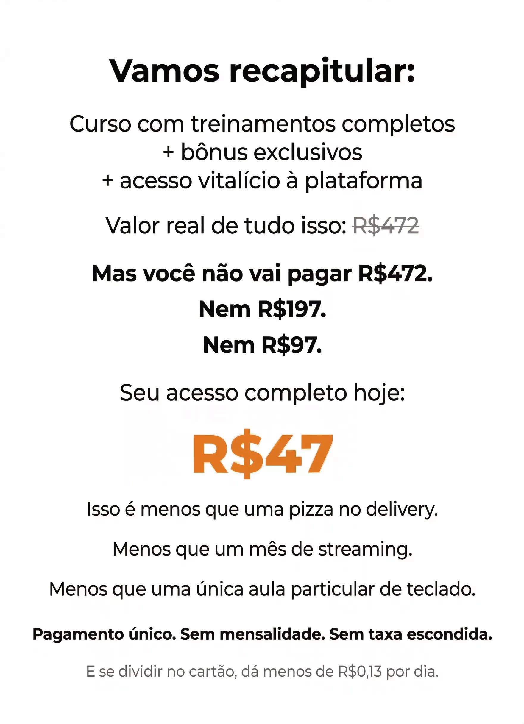 Ou você pode tomar uma decisão hoje. Por menos do que um jantar fora, você começa a destravar suas mãos, ouvir música saindo dos seus dedos e sentir o orgulho de finalmente estar fazendo aquilo que sempre sonhou.